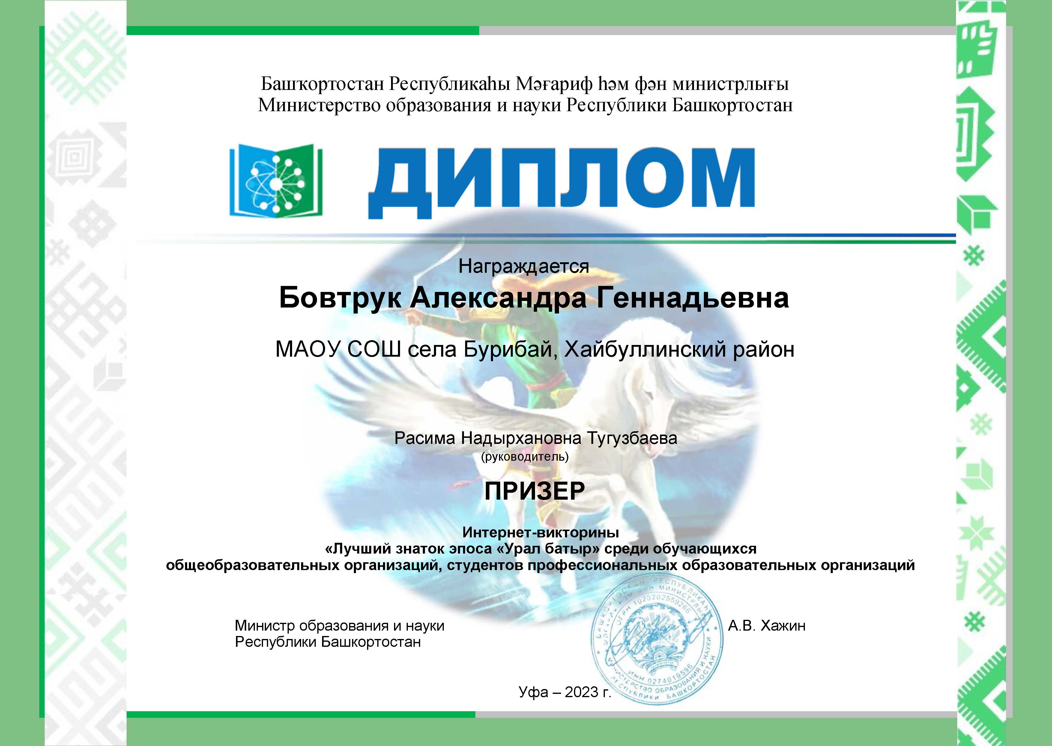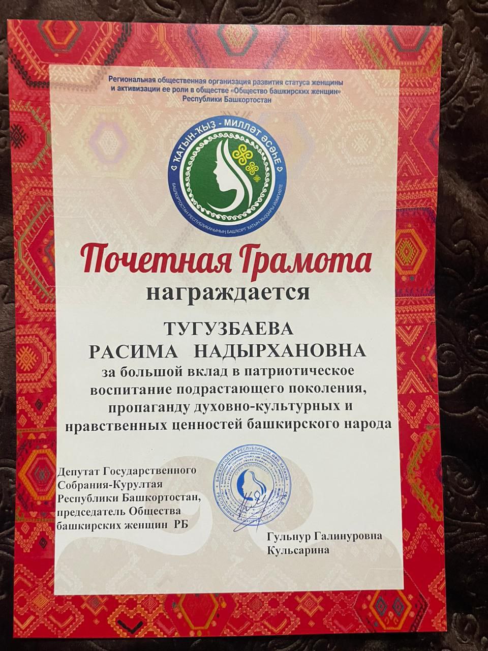 Являюсь неоднократным победителем муниципального этапа профессионального конкурса «Учитель года башкирского языка», победитель в номинации “Учитель – импровизатор” республиканского конкурса «Учитель года башкирского языка и литературы – 2002», Награждена Дипломом третьей степени МО РБ, Почетной грамотой Региональной общественной организации «Общества башкирских женщин» в 2022 году.