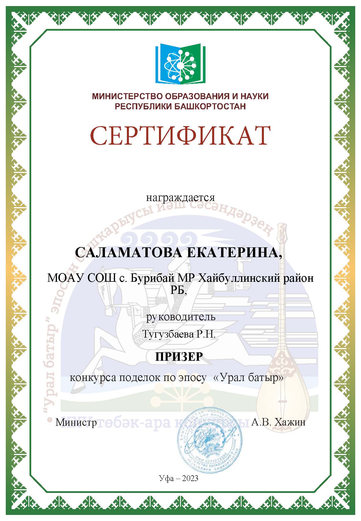 В 2020 году прошла курсы по программе “Системно – деятельностный подход как теоретико – методологическая основа формирования и развития УУД на уроках башкирского языка и литературы в условиях реализации ФГОС СОО”, Использование ИКТ в преподавании башкирского языка и литературы в условиях реализации ФГОС СОО”, 2023 году прошла курсы по теме “ Использование информационно – коммуникационных технологий в процессе реализации ФГОС” (72ч), “Обучение детей с ограниченными возможностями здоровья (ОВЗ) в условиях реализации ФГОС “ (72ч).